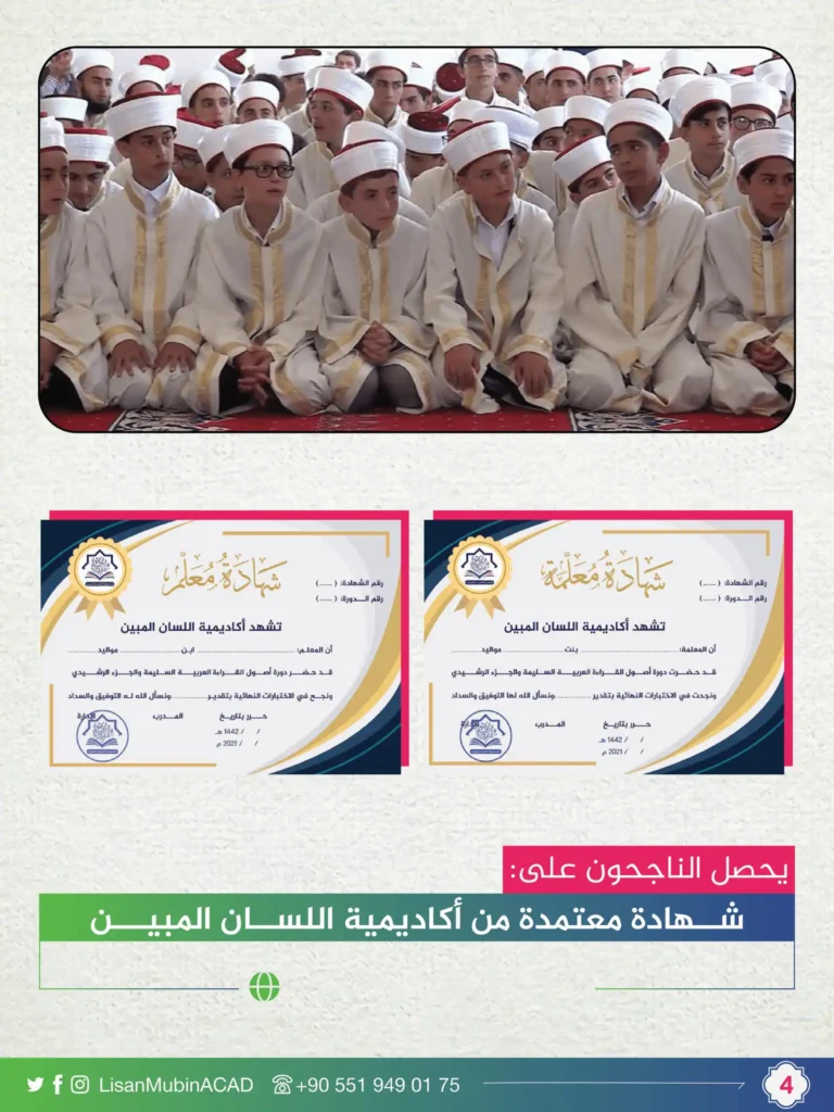 سيحصل على شهادة معلم معتمدة من قبل مؤسسة اللسان المبين